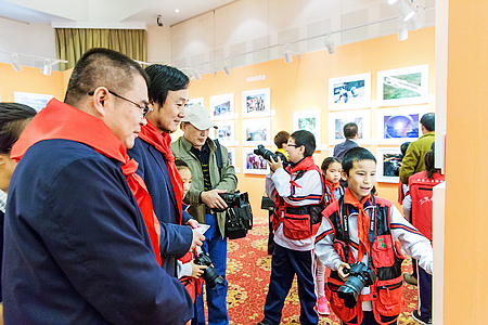 開幕式上,少先隊員們為嘉賓敬獻紅領巾。中國藝術攝影學會主席楊元惺戴上紅領巾后,向同學們講述起自己成為少先隊員的光榮經歷,講述自己學習攝影的過程和收獲,希望同學們珍惜現在優越的學習條件,學會用相機去發現、去記錄美好的生活,長大成為攝影家。