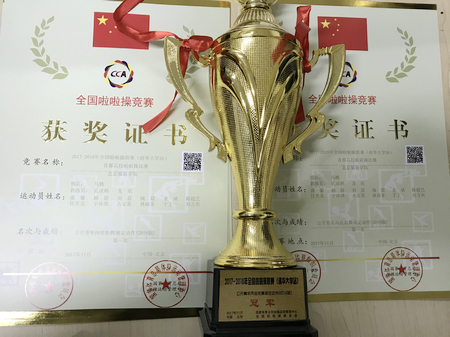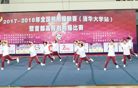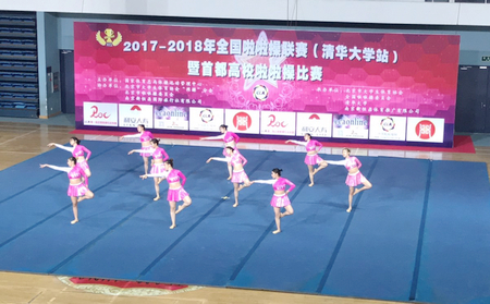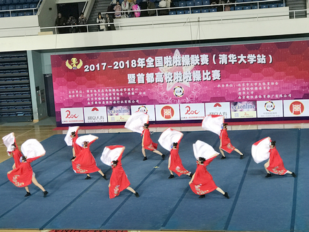 2017-2018年全國啦啦操聯賽--清華大學站近日在清華大學體育館舉辦。此項賽事是國家體育總局體操運動管理中心和中國大學生體育協會主辦的啦啦操最高級別的比賽,共有來自全國221支代表隊5500名選手參加角逐。我校代表隊在領隊馬騰、教練員孔凌鶴、龍欣的帶領下,全體隊員高水平地展示了競技風采,最終獲得公開青年丙組街舞啦啦操規定動作冠軍、自由舞蹈啦啦操亞軍、爵士規定動作第四名的優異成績,為學校贏得了榮譽。
