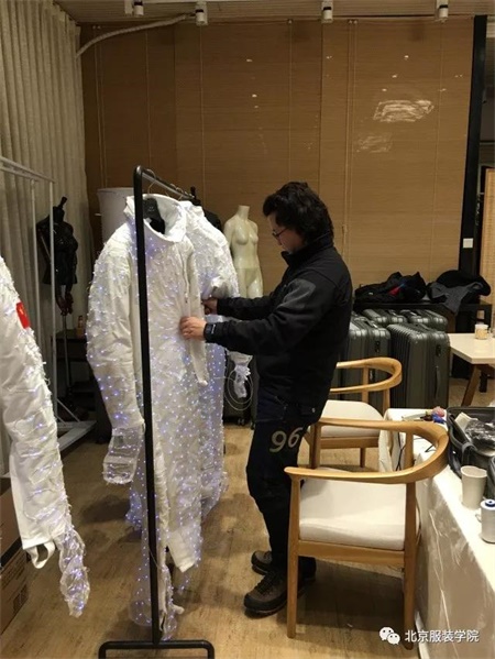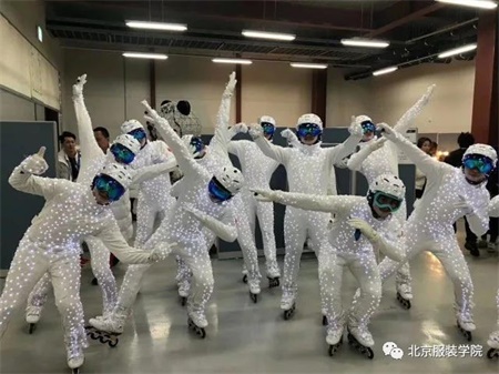 “北京8分鐘”表演團隊的排練場地在北京昌平。由于需要燈光,近兩個月密集排練基本都在夜間進行。冬天的北京非常冷,而據了解,平昌冬奧會期間室外溫度更是低至零下20攝氏度。演員的表演服裝需要輕薄,還要保暖,同時還要展現大幅度的表演動作,并且攜帶發光裝置,這些要求如何同時達到?對于設計師來說,平衡矛盾是設計的第一要義。北京服裝學院楚艷、周紹恩兩位老師挑戰不可能,創新設計,讓“北京8分鐘”表演服裝做到了“輕薄又保暖、合體又防風、運動又發光”。