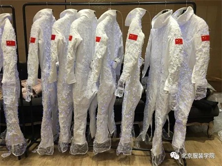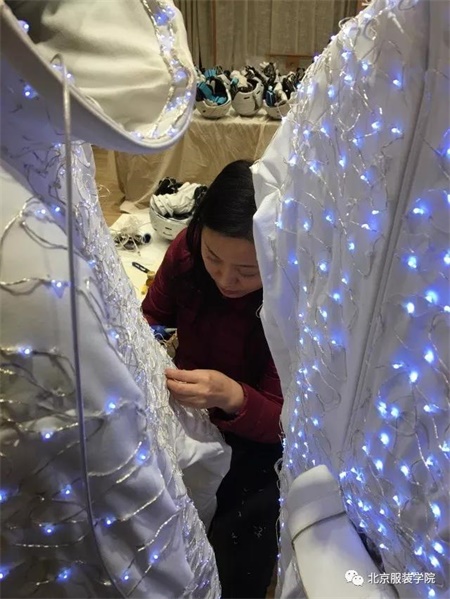 22套發光服,從設計圖稿到制作完成,三個多月的緊張工作,從調光技術到釘燈方案,歷經多次修改和調整,尤其是每套服裝都手工縫制上了8百多顆燈珠,加上頭盔上的100多顆燈,每套衣服制作完成就耗時極多。在平昌閉幕式上演前幾十次的彩排過程中,由于演出的劇烈運動和大幅伸拉動作,每次訓練完,都需要把每件衣服重新檢查修補一遍。直到演出前最后一刻,修檢工作仍在緊張進行,高級時裝定制的工匠精神助力運動型科技產品。