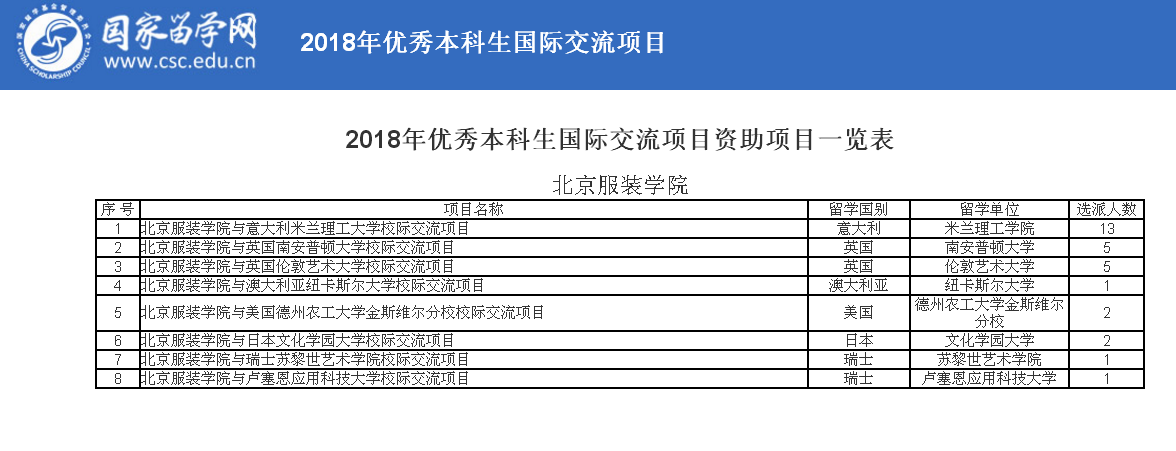 近日,國家留學基金委2018年優秀本科生國際交流項目資助項目結果公布,我校共八個項目獲批,其中,五個為繼續申請資助的2017年已獲批的項目(“北京服裝學院與英國倫敦藝術大學校際交流項目”“北京服裝學院與英國南安普頓大學校際交流項目”“北京服裝學院與意大利米蘭理工大學校際交流項目” “北京服裝學院與美國德州農工大學金斯維爾分校校際交流項目”“北京服裝學院與澳大利亞紐卡斯爾大學校際交流項目”),三個新申請項目,為“北京服裝學院與日本文化學園大學校際交流項目”“北京服裝學院與瑞士蘇黎世藝術學院校際交流項目”“北京服裝學院與瑞士盧塞恩應用科技大學校際交流項目”。