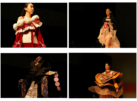 本屆畢業(yè)秀共展出70余套作品,由兩個(gè)部分組成。第一部分是北京服裝學(xué)院國(guó)際本科學(xué)生的畢業(yè)作品展示。設(shè)計(jì)作品中包括運(yùn)動(dòng)風(fēng)格和Oversize風(fēng)格,充分體現(xiàn)了運(yùn)動(dòng)流行趨勢(shì)和廓形的工藝技巧。畢業(yè)生于海洋以“快節(jié)奏的慢生活”為主題,運(yùn)用生活中的鮮艷顏色和現(xiàn)代城市節(jié)奏的代表性顏色,選擇工裝面料,并采用音頻元素與服裝相結(jié)合的方式,表現(xiàn)出人們身著寬松休閑的的衣服但井井有條的過著現(xiàn)代都市緊張生活的狀態(tài)。畢業(yè)生周睿的作品靈感來源是中國(guó)傳統(tǒng)的民間藝術(shù)——皮影。她把皮影轉(zhuǎn)動(dòng)的每一個(gè)動(dòng)作設(shè)定在一個(gè)時(shí)間的維度上,通過不同顏色的變換展現(xiàn)出一種別樣的時(shí)裝畫面美感。第二部分是北服國(guó)際畢業(yè)生專門為教育部留學(xué)服務(wù)中心的中國(guó)留學(xué)論壇準(zhǔn)備的,以貴州非物質(zhì)文化遺產(chǎn)為主要設(shè)計(jì)元素的服裝展示。設(shè)計(jì)師們親自到貴州千戶苗寨搜集一手設(shè)計(jì)素材,將少數(shù)民族的服裝風(fēng)格及服裝制作工藝與現(xiàn)代服裝理念相結(jié)合,設(shè)計(jì)出獨(dú)特新穎的服裝系列,使“中國(guó)元素”與“英國(guó)創(chuàng)意”得以完美呈現(xiàn)。