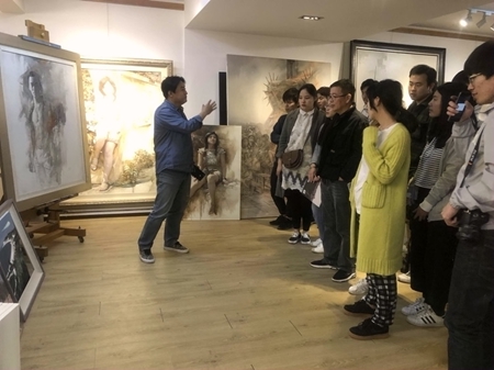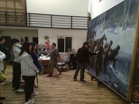 3月28日,油畫系部分研究生、2015全體本科生到北京宋莊進行實踐教學活動?;顒佑捎彤嬒蹈苯淌诟吆\娊y一規劃設計。師生分別走訪了駱根興、周武發、劉亞安、郭永文、劉瑞林等著名部隊專職創作員、畫家、藝術家的工作室。在實踐活動中,同學們認真學習、虛心求教,向被訪問的藝術家們學習創作經驗、創作方法與技巧,切身感受一線藝術家的創作生活。藝術家們分別與同學們展開交流和座談,在充分展示自己的作品的同時,也耐心地總結傳授創作經驗,啟發并鼓舞同學們的創作熱情。