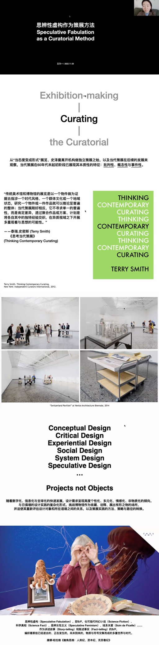 第五個(gè)演講主題是《思辨性虛構(gòu)作為策展方法》,策展人王乃一自2017年起,在中央美術(shù)學(xué)院設(shè)計(jì)學(xué)院開設(shè)“設(shè)計(jì)批評(píng)與策展研究”方向課程,從事設(shè)計(jì)策展的教學(xué)和研究工作。在主題演講中,她基于“思辨性虛構(gòu)”作為策展方法的理論反思與實(shí)踐研究,旨在審視其對(duì)當(dāng)下策展范式的影響,進(jìn)而探尋關(guān)于策展?jié)撛诨蚩深A(yù)見的未來。