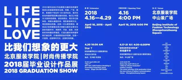 時尚傳播學院2018屆畢業設計作品展覽將持續到4月29日,17號-20號,每天下午16:00都有精彩的嘉賓演講和演出活動,歡迎大家一起來玩!