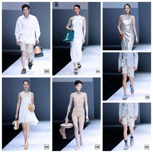 鞋品箱包部分的T臺秀根據風格被分為“簡初”“未極”“群氛”和“異格”四大部分。簡初部分以具有東方設計哲學思考的作品為主;未極部分則聚集了一批前衛、試驗性強的作品;群氛部分突出設計的輕松與趣味;異格部分表現了這批年輕設計師對符號化作品的嘗試。隱藏于作品當中的是年輕設計師們對于新材料、新技術的運用,對傳統工藝革新的探索以及對新概念的實驗性表達。