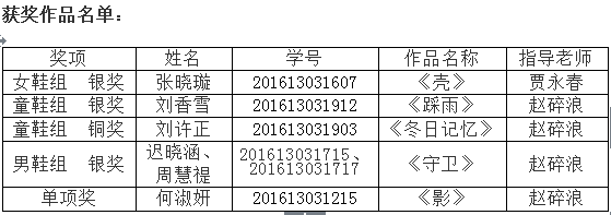 決賽共評選出院校組男鞋、女鞋、運動鞋、童鞋金獎1名、銀獎2名、銅獎3名。我校6位學生分別榮獲女鞋組銀獎、童鞋組銀獎、男鞋組銀獎、童鞋組銅獎和最佳DIY制作獎。