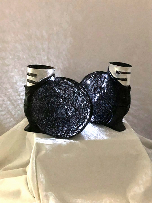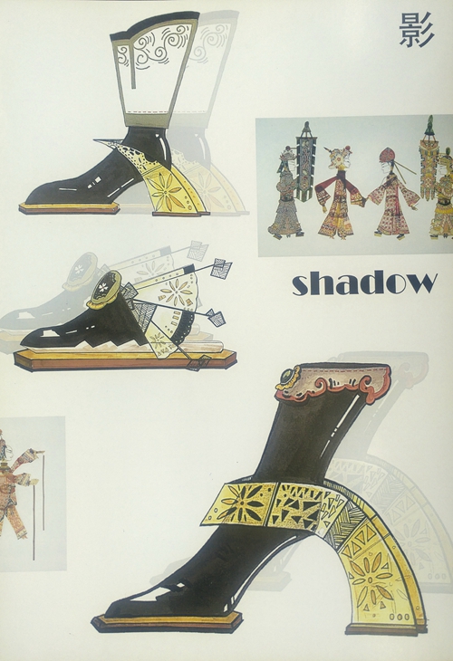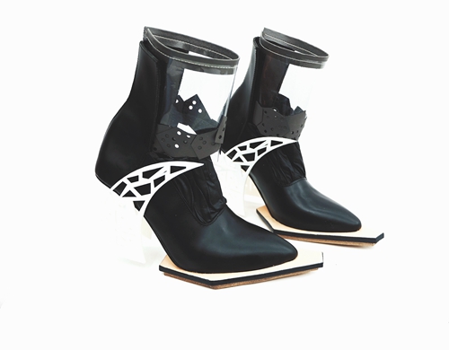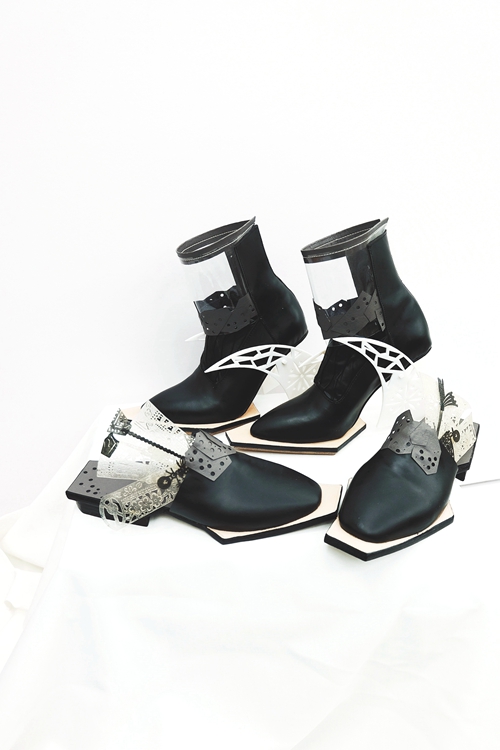 設計說明:我將鞋子塑造成一個舞臺,穿上這雙鞋就仿佛皮影在舞臺上的輕盈。高跟鞋的鞋跟部分運用了3D打印技術,鞋跟可以跟隨喜好隨意轉動調整,就像皮影的肢體。鞋面的鏤空花紋的靈感來源于皮影上面的鏤空,加入了一些現代的元素。鞋面上的拼接和鏤空同樣源于皮影的要素,整雙鞋偏向于現代風。