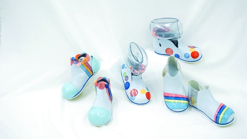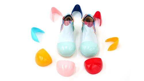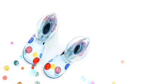 設計說明:本系列為兒童雨鞋,靈感源自于水上步行球,充氣透明材質模擬雨滴打在玻璃上的質感。繽紛彩色配件,隨意搭配,感受色彩碰撞。裝有可拆卸替換保護殼,將腳易受傷的部位保護起來,讓孩子雨天也肆意玩耍。