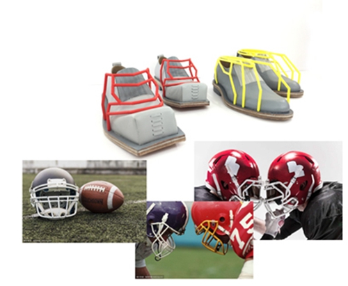 設計說明:本組男鞋靈感來源于橄欖球比賽中的頭盔,因橄欖球比賽激烈,對裝備的質量要求很高,頭盔中的護面框由金屬空新管材質制成,其雖空心但卻具有比重小強度大的特點。我們通過提取頭盔中護面框元素來表現男性的耿直、豪爽與剛毅。