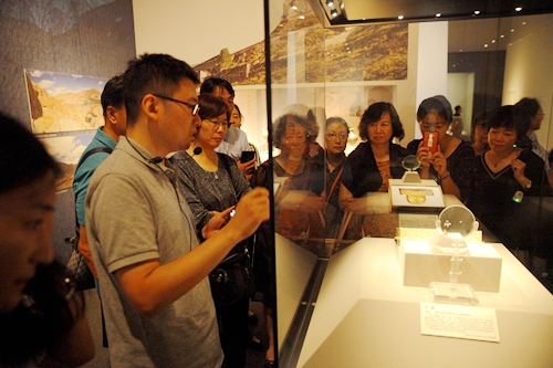 一件件精美的展品吸引著老師們的目光,大家不時駐足欣賞并拿出手機拍照。講解員專業而細致的講解,使老師們對西藏以及意大利文藝復興期間的歷史、文化發展等有了進一步的了解和直觀的印象。參觀結束后,中心組成員集體在首博牌樓前合影留念。