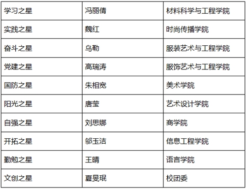 為表彰先進、樹立典型,充分調(diào)動學生的學習積極性,激勵其他在校生努力學習,奮發(fā)向上,促進良好的校風、學風的形成,北京服裝學院開展2018屆“畢業(yè)十星”的評選活動。根據(jù)“公開、公平、公正、擇優(yōu)”的原則,我校最終評選出十位校級優(yōu)秀畢業(yè)生當選“畢業(yè)十星”,他們分別是: