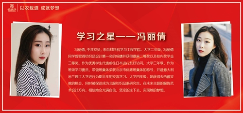 馮麗倩,中共黨員,來自材料科學與工程學院。大學二年級,馮麗倩同學曾取得紡織品設(shè)計第一名的成績并獲得桑麻二等獎以及校內(nèi)獎學金三等獎。作為優(yōu)秀學生代表前往日本進行友好訪問。大學三年級,作為班級學習委員,帶領(lǐng)班集體榮獲北京市優(yōu)秀班集體的稱號,并赴意大利米蘭理工大學進行為期半年的交流學習。大學四年級,她獲得去西藏支教的機會,同時被保送成為北服紡織品系研究生。在未來主題的服飾藝術(shù)設(shè)計方向,相信她會充滿自信、堅定的走下去,實現(xiàn)她的夢想。