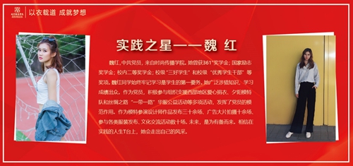 魏紅,中共黨員,來自時尚傳播學院。她曾獲361°獎學金;國家勵志獎學金;校內(nèi)二等獎學金;校級“三好學生”和校級“優(yōu)秀學生干部”等獎項。魏紅同學始終牢記:學習是學生的第一要務。她廣泛涉獵知識,學習成績出眾。作為黨員,積極參與組織支援西部地區(qū)愛心捐衣、夕陽模特隊和絲綢之路“一帶一路”華服公益活動等多項活動,發(fā)揮了黨員的模范作用。作為模特,參演設(shè)計師作品發(fā)布三十余場、廣告大片拍攝十余場、參與各類服裝發(fā)布、文化交流活動數(shù)十場。未來,是為有備而來。相信在實踐的人生T臺上,她會走出自己的風格。