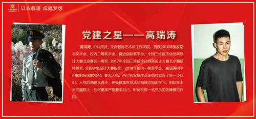 高瑞濤,中共黨員,來自服飾藝術(shù)與工程學院。曾獲2016年國家勵志獎學金、校內(nèi)二等獎學金、奮進創(chuàng)新獎學金;全國三維數(shù)字化創(chuàng)新設(shè)計大賽北京賽區(qū)一等獎;2017年全國三維數(shù)字化創(chuàng)新設(shè)計大賽北京賽區(qū)特等獎、全國鐘表設(shè)計大賽銀獎;2018年校內(nèi)一等獎學金。高瑞濤同學積極響應國家號召,參軍入伍。兩年的軍旅生活使他對黨有了進一步認識。入黨后他要求進步,積極參加黨員活動和理論知識學習。相信在未來的道路上,他將更加嚴格要求自己,時刻發(fā)揮一名黨員的先鋒模范作用。