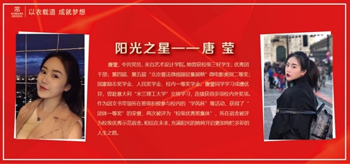 唐瑩,中共黨員,來自藝術(shù)設(shè)計學院。她曾獲校級三好學生;優(yōu)秀團干部;第四屆、第五屆“北京普法微視頻征集展映”微電影類別二等獎;國家勵志獎學金、人民獎學金、校內(nèi)一等獎學金。唐瑩同學學習成績優(yōu)異,曾赴意大利“米蘭理工大學”交換學習,連續(xù)獲得多項校內(nèi)外獎項。作為團支書帶領(lǐng)所在班級積極參與校內(nèi)的“學風杯”等活動,獲得了“團體一等獎”的榮譽,兩次被評為“校級優(yōu)秀班集體”,所在宿舍被評為校級優(yōu)秀示范宿舍。相信在未來,充滿陽光的她將開啟更加絢爛多彩的人生之路。