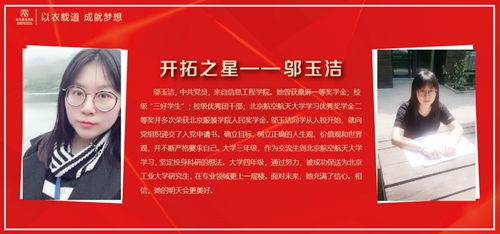 鄔玉潔,中共黨員,來自信息工程學院。她曾獲桑麻一等獎學金;校級“三好學生”;校級優(yōu)秀團干部;北京航空航天大學學習優(yōu)秀獎學金二等獎并多次榮獲北京服裝學院人民獎學金。鄔玉潔同學從入校開始,就向黨組織遞交了入黨申請書。確立目標,樹立正確的人生觀、價值觀和世界觀,并不斷嚴格要求自己。大學三年級,作為交流生到北京航空航天大學學習,堅定投身科研的想法。大學四年級,通過努力,被成功保送為北京工業(yè)大學研究生,在專業(yè)領(lǐng)域更上一層樓。面對未來,她充滿了信心。相信,她的明天會更美好。