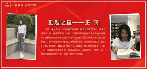 王晴,中共黨員,來自語言文化學院。她曾獲361°獎學金;“校級三好學生”和“優(yōu)秀團干部”稱號。王晴同學四年的綜合素質(zhì)成績排名第一,曾獲得到對外經(jīng)濟貿(mào)易大學訪學的機會,并成為市級優(yōu)秀畢業(yè)生的候選人。她利用課余時間參加了義務支教活動,幫助孩子們解決作業(yè)上的問題。她常說“不管遠方的夢想有多么的遙不可及,路就在腳下,只要一步一步踏踏實實地走下去,就會到達遠方,實現(xiàn)夢想”。勤勉一詞,可能早已烙印在她的心間,成為了她的生活態(tài)度。