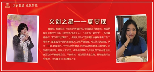 夏旻珉,預備黨員,來自時尚傳播學院,校團委藝術(shù)團團長。她曾獲校級優(yōu)秀學生干部;團學組織先進個人;“北京市三好學生”;五四青春榜樣“藝氣風發(fā)好青年”;全國大學生廣告比賽北京賽區(qū)平面廣告二等獎等。夏旻珉同學團隊意識強,對工作嚴謹負責,對生活充滿熱情。從大一開始,她便加入了學生會的大家庭,各種活動都有她參與的身影。回到櫻花園校區(qū),她加入藝術(shù)團,成功組織策劃了多項大型文化創(chuàng)意活動,在活動中不斷磨練自己,不斷成長。相信她的未來之路,將繼續(xù)發(fā)揮自身優(yōu)勢,書寫屬于自己的精彩人生。