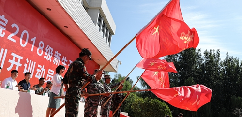 大會開始,伴隨著雄壯的中國人民解放軍軍歌,北京服裝學院2018級新生軍訓動員大會拉開了帷幕。在介紹完嘉賓和領導后,艾麗為參訓營授旗,儀式莊嚴隆重。