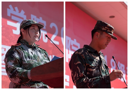 接下來,受訓學員代表美術學院陳荷佳同學發言,她代表全體學生感謝教官與老師們,認為軍訓可以增強大家的使命感和集體榮譽感,呼吁同學們盡善盡美地完成軍訓。緊接著,軍訓教官代表閆志錦發言,他保證將以最飽滿的精神狀態迎接訓練,對此次訓練有高度的責任感,一要科學訓練,精心組織;二要在訓練中嚴密組織、耐心指導;三要思想上重視。