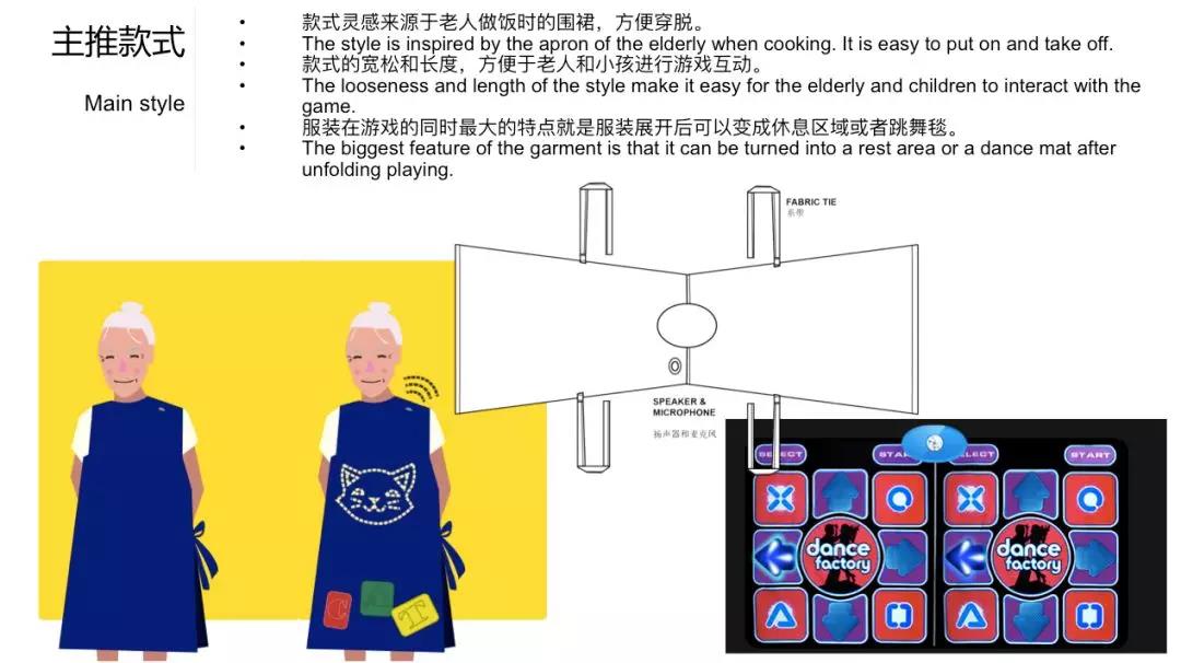 獲得銅獎(jiǎng)的小組以溝通連接與幸福感,該小組經(jīng)調(diào)查發(fā)現(xiàn)老人是中國(guó)家庭帶娃的主力軍。因此根據(jù)各類老人設(shè)計(jì)出不同款式的衣物,因而達(dá)到老人與小孩最佳的互動(dòng)。衣服可以通過色塊顯示圖像提供拼單詞與拼圖像兩種游戲方式衣服上使用柔性電磁鐵,在答案錯(cuò)誤時(shí)消磁游戲結(jié)果將會(huì)反饋給父母。