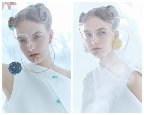 本系列設計意在探討身體與植物的互生關系,呈現顯微視角下植物的呼吸、繁衍和認知,強調有趣佩戴與未來時尚,再造首飾語境下的未來植物美學。設計師聯合敘事空間設計師和動畫師使用數字巫術,以Welcome to my planet 為線索,把秀場營造成一個多媒體故事空間,為觀眾講述了一個人類穿越時空,探索植物星球的幻想故事。