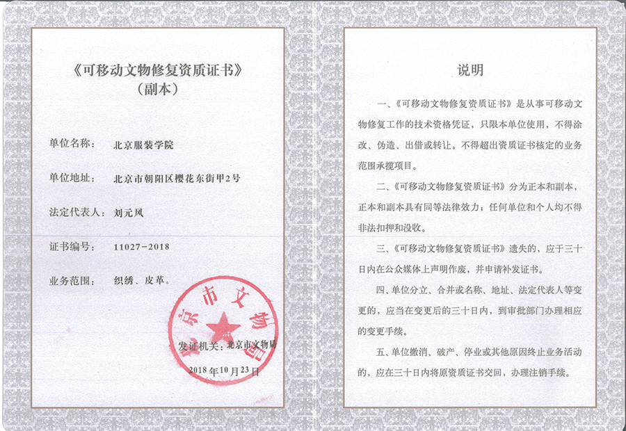 - 民族服飾博物館獲北京市文物局頒發(fā)的《可移動(dòng)文物修復(fù)資質(zhì)證書》