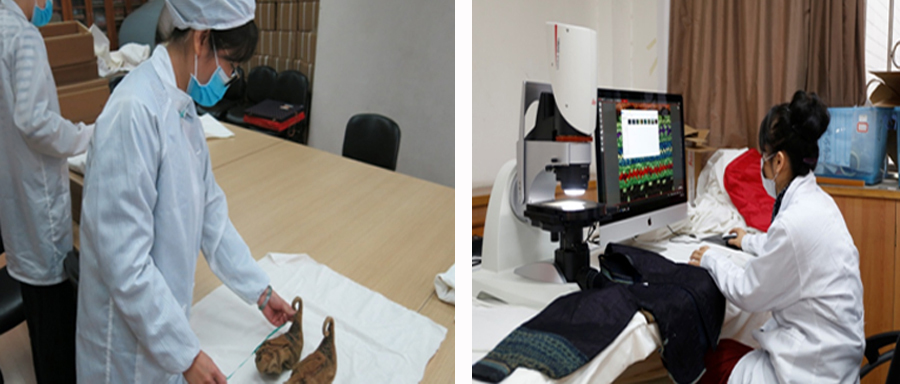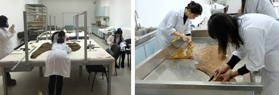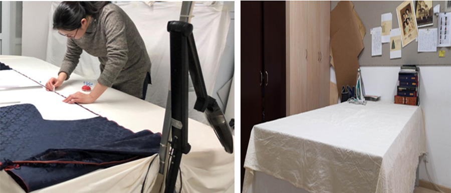 2016年得學(xué)院大力支持,籌建文物保護(hù)修復(fù)工作室,博物館嚴(yán)格按照文物局的相關(guān)要求,建立了總計(jì)300平方米的紡織品文物修復(fù)工作區(qū)域。于2017年建成,修復(fù)工作室設(shè)立于民族服飾博物館內(nèi),分為信息采集、清洗整形、工藝研究三個(gè)區(qū)域,做到干濕分離,病害隔離。并依托我校服飾藝術(shù)與工程學(xué)院現(xiàn)有的首飾設(shè)計(jì)制作、手工皮革工藝制作兩方面的優(yōu)質(zhì)資源與之聯(lián)合開展館藏金銀飾品、皮革等文物的修復(fù)保護(hù)工作。修復(fù)工作室設(shè)備設(shè)施科學(xué)完善,并制定相關(guān)管理?xiàng)l例、安全保衛(wèi)方案和應(yīng)急預(yù)案。根據(jù)文物局相關(guān)規(guī)定博物館就文物保護(hù)事宜制定《北京服裝學(xué)院民族服飾博物館質(zhì)量評(píng)價(jià)體系文件》一套4冊(cè) ;《北京服裝學(xué)院民族服飾博物館管理制度匯編》一冊(cè);《北京服裝學(xué)院民族服飾博物館文物修復(fù)工作規(guī)范化建議與儀器裝備基本要求》一份;《北京服裝學(xué)院民族服飾博物館藏文物保護(hù)修復(fù)工作室管理制度》一份;《紡織品文物修復(fù)保護(hù)工作流程》一份。
