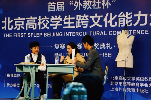 北京高校學生跨文化能力大賽旨在為高校師生搭建一個展示跨文化能力風采、交流跨文化教學經驗的平臺。復賽中,來自北京各高校的參賽隊伍通過表演和分析自己編寫的跨文化案例,展現了對跨文化交際的理解和對相關理論的應用能力。由我校服裝藝術與工程學院的劉禹廷、信息工程學院的方天成和藝術設計學院的花杰同學組成的北京服裝學院代表隊,在指導教師劉慶華的帶領下,經過17日全天的激烈角逐,位居前10名的團隊躋身18日的決賽。