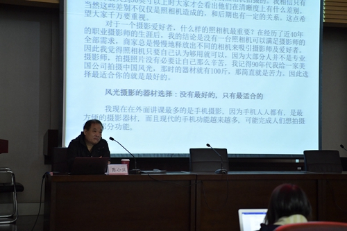 接下來,時尚傳播學院攝影系陳小波教授為大家帶來了《我眼中的好照片》精彩講座。陳老師通過攝影類型的介紹和攝影器材的選擇,重點講述了風光拍攝技巧方法,通過照片的展示和解讀,教會大家如何使用光線和鏡頭,駕馭不同場景的風格景色拍攝。