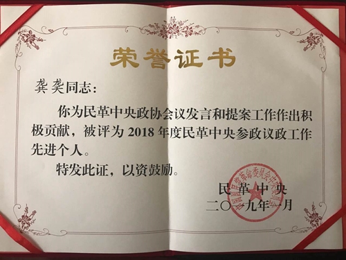 北京服裝學院副教授、民革十三屆中央教科文衛體委員會委員、援疆干部龔?獲得“2018年民革中央參政議政工作先進個人”。該獎項是民革中央設立的獎項,每年評選一次。龔?副教授的提案被列入本次獲獎名單中,這是我校黨外知識分子首次在民革全國參政議政工作會議上獲得獎項,體現了對北服“援疆”工作的高度支持與認可。龔?副教授目前在新疆生產建設兵團一師阿拉爾市塔里木大學掛職擔任機械電氣化工程學院副院長,協助塔里木大學籌建紡織服裝學院,并協助新疆生產建設兵團南疆發展紡織服裝產業規劃。