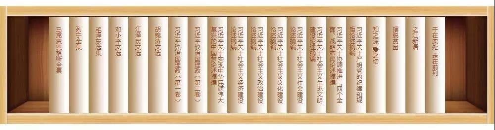 包含馬克思、恩格斯、列寧、毛澤東、鄧小平、江澤民、胡錦濤、習(xí)近平的著作或相關(guān)輔導(dǎo)材料,一共295本。其中習(xí)近平重要講話單行本63本、習(xí)近平著作7本、習(xí)近平重要論述摘編20本、習(xí)近平新時(shí)代中國(guó)特色社會(huì)主義思想學(xué)習(xí)輔導(dǎo)材料18本。
