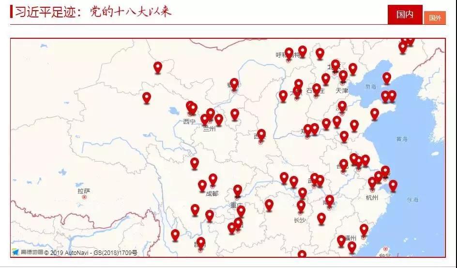 包括國(guó)內(nèi)和國(guó)外兩張互動(dòng)地圖,讀者能夠通過(guò)移動(dòng)鼠標(biāo),看到習(xí)近平十八大以來(lái)曾經(jīng)到過(guò)的地方。