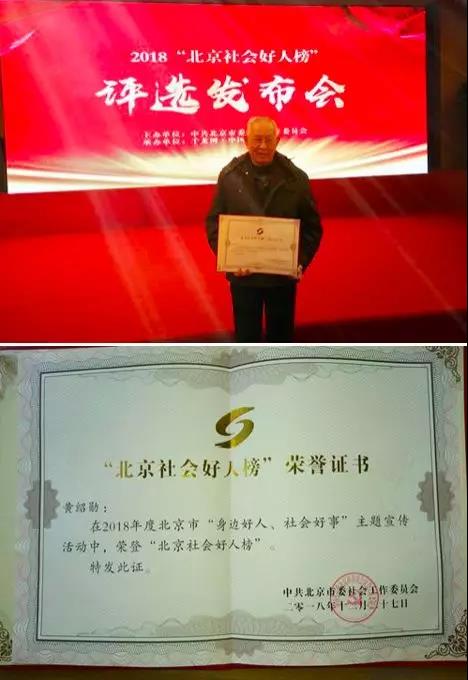2018年12月28日,由于黃老師一直熱心公益、敬業(yè)奉獻(xiàn),被推薦為“北京社會(huì)好人榜”典型人物上榜,成為北京高校唯一一名上榜者。