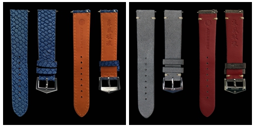 表帶方面,“霽”和“皓”均可搭配三種不同風格的表帶——深藍色頭層光滑小牛皮,灰色翻毛皮搭配紅色頂紋小牛皮,藍色鮭魚皮搭配鮮橙色頂紋小牛皮,表帶背面印有“乘風破浪”四個漢字。