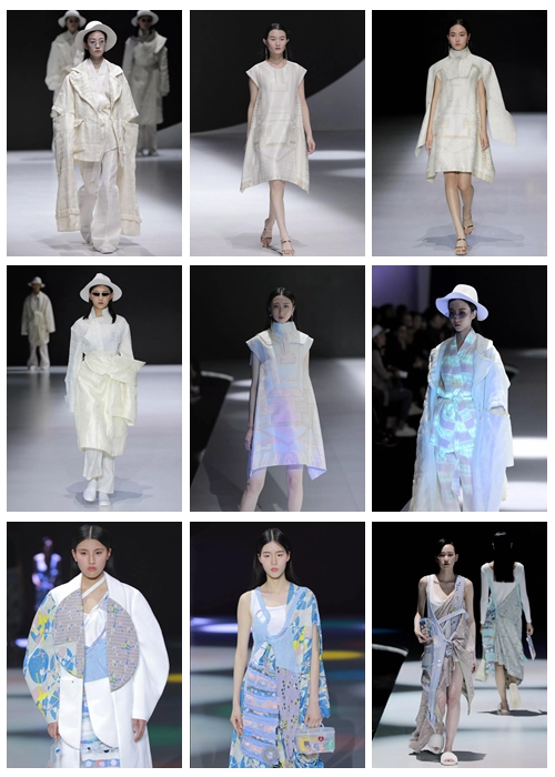 大秀呈現(xiàn)出的設(shè)計(jì)作品靈光閃動、想象力生動活潑。在面料、色彩、廓形和織物解構(gòu)的創(chuàng)新上,不斷探索和驗(yàn)證著未知性、實(shí)驗(yàn)性的美好可能。諸多前沿科技的應(yīng)用,如在黑暗中流光溢彩熠熠生輝的光質(zhì)變色纖維智能服裝,在服飾領(lǐng)域的功能性、美觀性、實(shí)用性上都有重要的現(xiàn)實(shí)意義。第一屆實(shí)驗(yàn)班的全產(chǎn)業(yè)鏈設(shè)計(jì)師們在實(shí)驗(yàn)室研發(fā)將天賦靈氣完美落于設(shè)計(jì)實(shí)體,讓人直觀感受到纖維專業(yè)跨領(lǐng)域的先鋒性、開拓性。