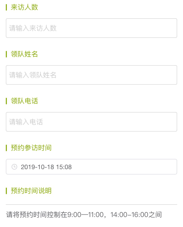 來賓向系統提供來訪人數、領隊姓名、領隊聯系方式、預約參訪時間段(9:00——11:00或14:00——16:00)、是否需要講解等信息后,等待黨委宣傳部及團委審核,收到反饋。