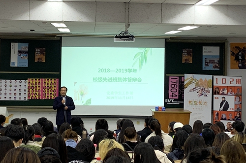 為學(xué)習(xí)貫徹黨的十九大、十九屆四中全會和全國教育工作會議、北京市教育大會精神,充分發(fā)揮班級在學(xué)風(fēng)建設(shè)、思想政治教育和服務(wù)大學(xué)生全面成長成才中的積極作用,我校于11月14日下午在櫻花園校區(qū)新階一舉辦了2018—2019學(xué)年校級先進班集體答辯會。校黨委副書記倪賽力以及來自黨委組織部、宣傳部、教務(wù)處、思政部、學(xué)生處、校團委、后勤和語言文化學(xué)院的負(fù)責(zé)老師和學(xué)生代表擔(dān)任評委,200余名學(xué)生代表和班主任、輔導(dǎo)員老師一起見證了先進班集體的誕生。