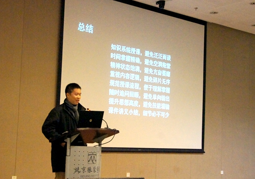 最后,我校藝術設計學院教師孫一凡做《以比賽促進教學質量提高》報告。孫一凡老師是我校第十三屆青年教師教學基本功比賽中一等獎獲得者,今年再接再厲,斬獲北京高校第十一屆青年教師教學基本功比賽一等獎、最佳教案獎、最佳現場演示獎等5項大獎,為學校爭得了榮譽。他結合自身參賽的實戰經驗,從有效交流、授課內容、規范流程三個方面闡釋了心得與體會。