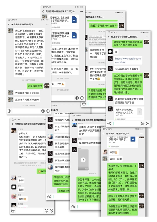 對于授課教師而言,采用網上教學新模式,不僅要重新編寫教案、設計教學內容,還要快速學習直播平臺的交互方式,這無疑是一場全新的挑戰。針對此問題,美術學院快速響應,成立了以張楠、李棟老師為組長,部分青年教師為成員的一對一“在線平臺使用技術輔導小組”,小組以“合理適度,鼓勵老師學習在線教學,不落下一個老師,一對一解決問題”為工作原則,自2月5日起對教師開展培訓和幫助。2月15日,完成了對師生在測試過程遇到問題的實時在線答疑和遠程指導。2月16日,學院成立線上教學測試試講聽課臨時工作小組。2月17-18日,完成了全部線上課程的試講測試。
