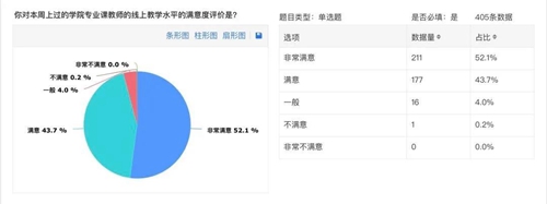 一周的線上教學完成后,學院及時開展了學生滿意度調查活動。調查數據顯示,學生對專業課教師的線上教學水平非常滿意和滿意為95.8%,對學院專業課線上教學整體質量非常滿意和滿意為89.9%。