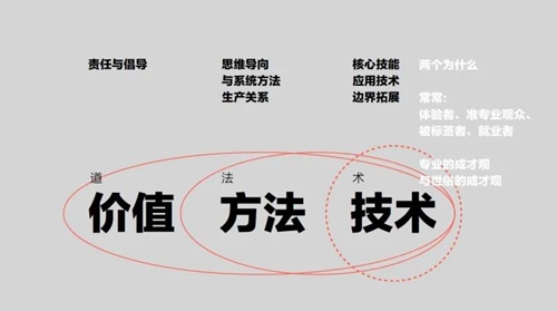 郭老師認為,藝術設計類專業教學肩負著 “培養他人創造力(發現問題并解決問題)”這一具有挑戰性的命題。教師僅依靠個體努力精心備課、各自為戰,不足以使各門課程系統性地從“百草園變成精心規劃的花園”,教師團隊對學校及學院的定位與識別、共通性和系統性的教學方法、社會發展需求與趨勢前沿進行辨析,開展協同教研、備課等教學活動極其重要。專業的價值、倡導、識別可以從“道”“法”“術”三個層面展開認識。區別專業成才觀與世俗成才觀,需要思考“有工作不代表會工作”“能夠駕馭工作才有可能享受工作”,學院品牌很大程度上體現在畢業生所呈現出來并長時間保持的學習力和引領力。專業教學目標與內容不能停留在“術”的層面,系統的工作方法和應對需求而快速組織有效的生產關系,已經成為重要的創造性工作要求,還要包括價值責任意識的培養,讓他們從社會責任的更高維度,從“為他人、為社會而設計”的“初心”出發,更具主動性地樂學好研,才能保持可持續的創造力與競爭力。