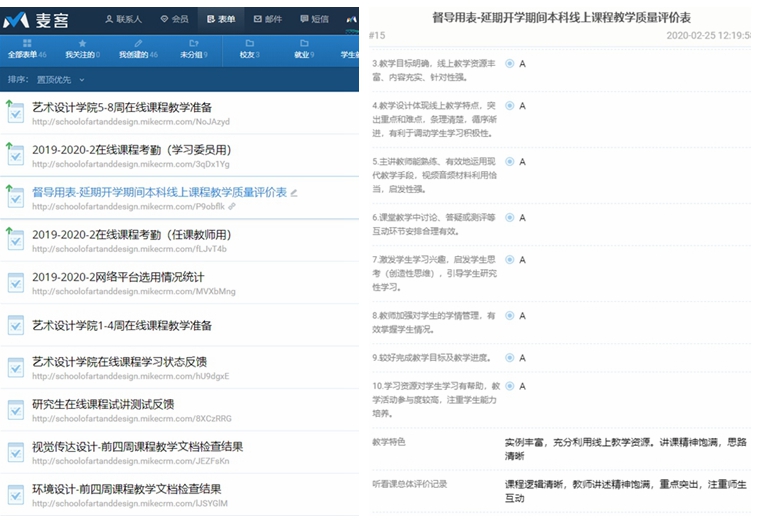 從假期期間組織教學平臺測試、教學資料的收集和檢查任課教師和學習委員的出勤情況反饋、教學督導評價等,張倩老師根據工作需要親自專門制作了多個簡潔清晰的線上表單,方便快捷,便于統計和隨時反饋。目前已回收教學督導評價65份,評價中肯詳盡。整體評價高,尤其是對教師的教學狀態、應對在線教學采用的教學方法和內容調整給予了高度肯定。