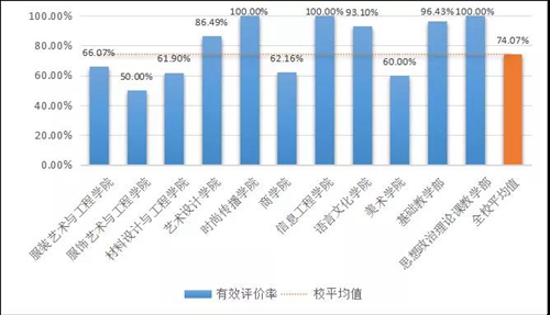 有效評價率是指回收學生評價樣本數達標的教師人數與開課教師總人數之比,這個數據反映的是本部門落實評教工作情況及學生的參與熱情。參考學校常用班級規模(通常藝術類20人左右,非藝術類30人左右),對某位教師評價的樣本回收份數超過半數視為有效評價,即藝術類學院教師以不少于10份、非藝術類學院教師以不少于15份為基本要求。本次評教全校有效評價率為74.07%,各教學部門的有效評價率見圖2。圖中可見6個部門的有效評價率超過80%,其中3個部門的有效評價率達100%,5個部門的有效評價率低于70%。