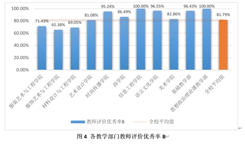 按常規將評價分數90分以上視為優秀,各教學部門教師評價優秀率可以從兩個維度考量:第一,教師評價優秀率A,是指評價分數90分以上的教師人數與被評教師總人數之比(詳見圖3);第二,教師評價優秀率B,是指評價分數90分以上的教師人數與開課教師總人數之比(詳見圖4)。根據二者的定義可知,二者越接近,部門的教師覆蓋率越高,越能反映部門教師的整體情況。反之,相差越大,部門的教師覆蓋率越低,越難以反映部門教師的整體情況。在進行比較時,不難發現有些單位的教師評價優秀率A與教師評價優秀率B反差較大,差的最多的達29.06%。這種情況下,當教師評價優秀率A較高時,極易給人留下評教覆蓋到的老師對自身線上教學的效果更自信的印象。因此,建議二者反差較大的教學部門積極關注評教未覆蓋到的教師的教學狀況。