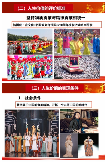 例如,為講解如何在實現個人價值的同時實現社會價值,選取了服裝藝術與工程學院教師楚艷參與2014年APEC會議領導人服裝設計、登上央視《國家寶藏》節目再現唐代服飾風采的案例,鼓勵學生以專業為窗口,為我國服裝紡織行業的發展以及國家軟實力的提升做出貢獻。年輕校友及本校教師的成功案例最容易引起學生共鳴,有助于教學效果的提升,在對學生進行思想政治教育的同時也進行了愛專業和愛校教育。