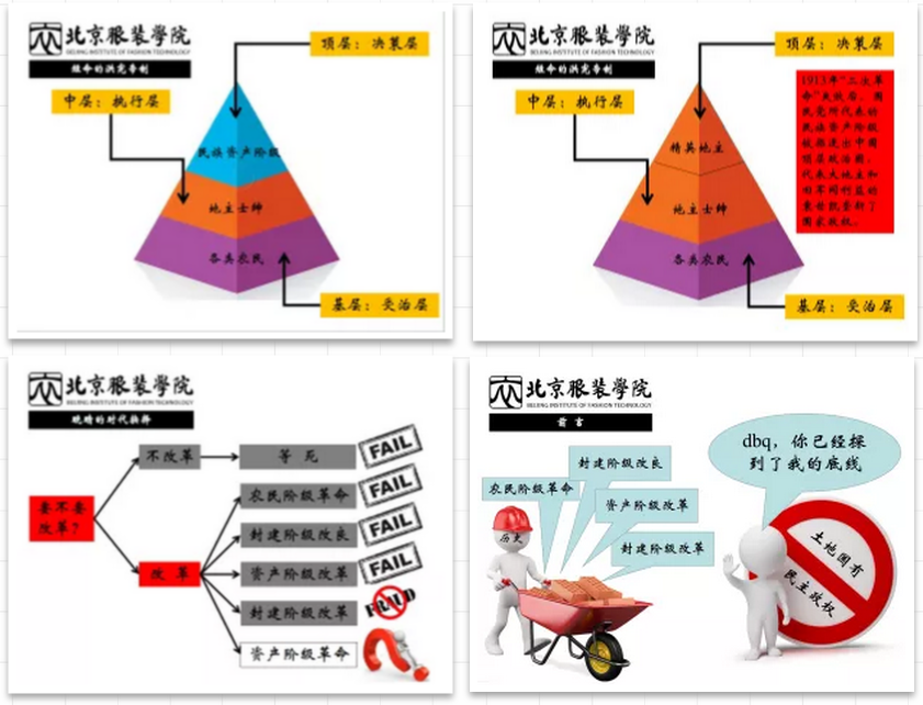 2.理論具象:網絡授課缺少板書的自由勾畫,這導致了一些抽象的理論問題只能通過可視的方式給學生呈現。我選取的原則就是將抽象理論具像化,讓視覺的認知部分地替代理論思考,實現識圖即識理的思維對接。比如談到近代中國的革命道路抉擇,我選取故事結構圖來表現。讓看似雜亂的各種運動、革命、起義在一個整齊的視覺框架下呈現出宏觀結構;此外,封建體制垂而不死,長期阻礙中國社會變革是綱要課程的教學重點,但是如何簡明扼要地解釋封建體制的超穩定結構及其對歷史發展阻滯同樣是難點,依然還是需要借用識圖認知的手段。
