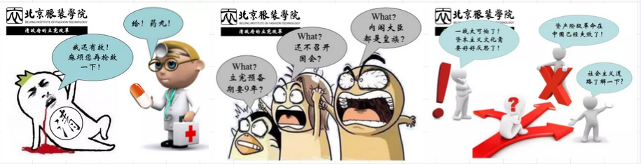 3.史例形象:理論需要有切實的例證來表達,但是歷史的實例往往都是有著較大時間跨度和較多因數參與的復雜系統。用擬人擬物的可視圖形來重建場景成為講清故事、捋順脈絡的絕好手段。比如在闡釋“無產階級的階級覺醒”這類過程性事物時,需要將所有線索集中于一頁課件中,只有這樣才能有助于宏觀理解,所以我選用了擬人圖形來濃縮要素。再比如說清末立憲改革一事,要涉及到較為專業和枯燥的憲制理論背景。避繁就簡,使用圖片以第一人稱視角來展現立憲運動的漏洞即可。