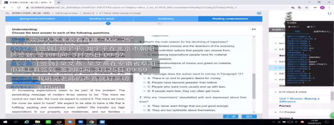 經過隨機聽課,包括加入授課教師的班級課程群,關注同仁的教學全過程,結合自身的教學實踐,從教師角度而言,不同網絡平臺優缺點并存,面對本科的大班教學、研究生公共課和專業課的教學,針對課程教學類型等,依據不同的教學對象、不同的教學規模、不同課程的內容與特點,教師確實需要對原來的教學實施全方位的更新設計與悉心安排,體諒學生由于學習環境差異帶來的溝通與理解的不便,包括注意力的不集中;教師從語調到語速,到節奏的把握,都需要換位思考,才有可能達到理想狀況,也才有可能體會到授課后之后身心的愉悅。在這方面,我院訾韋力老師充分利用各個不同教學平臺,完美實現了教學目標。正如督導組郭燕教授所說,“訾老師《大學英語4》課程,運用多個教學平臺,實現不同的教學目標和任務。將課堂有限的90分鐘時間,用來講授課文重點、難點,要求學生必須完成課前預習、課后練習。”